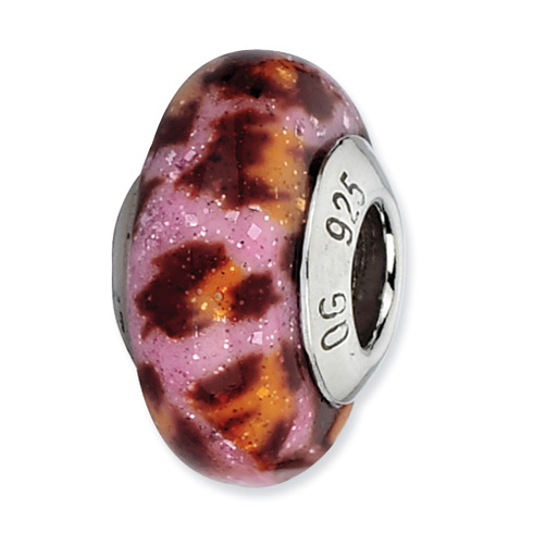 This pink and brown jaguar pattern glass bead with glitter is made of antiqued sterling silver. Bead size: 13.7mm x 7.2mm. This Reflections bead fits all major modular bracelet brands. Made in Italy.