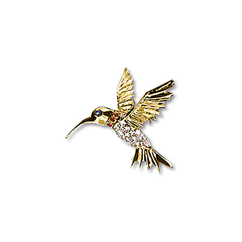 This 14k yellow gold hummingbird pendant is not flat, it is dimensionally sculptural. Features nine-diamond pavé in the body. Diamond color: G-I, clarity: SI2, CT TW: 0.18. Item size: 1 1/4in x 1 1/4in. Designed by animal sculptor Jack Slack. Approximate weight: 4.1 grams. Handmade in the U.S.A. Hollow back.