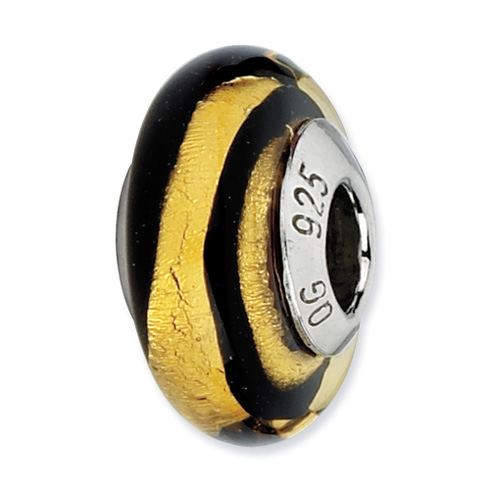 This gold and black striped Murano glass bead is made of antiqued sterling silver. Bead size: 13.7mm x 7.2mm. Bead hole: 4.00mm diameter. This Reflections bead fits all major modular bracelet brands. Made in Italy.