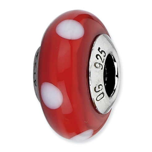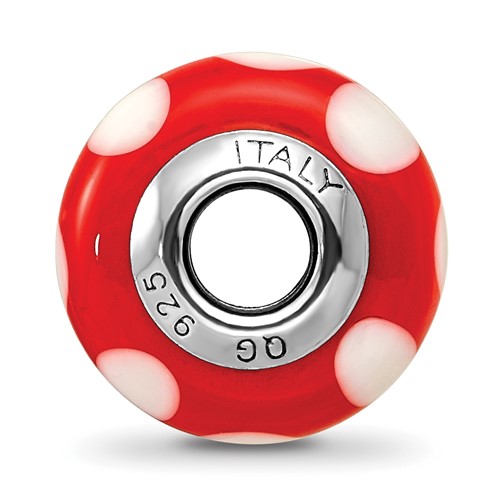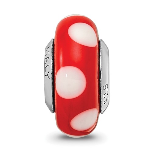This red and white dots Murano glass bead is made of antiqued sterling silver. Bead size: 13.6mm x 7.2mm. This Reflections bead fits all major modular bracelet brands. Made in Italy.