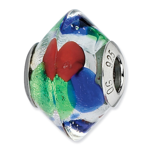 Blue, green, red and silver Murano glass bead is made of antiqued, solid sterling silver. Bead dimensions: 14.5mm x 11.8mmm. Bead hole: 4.00mm diameter. This Reflection bead fits all major modular bracelet brands. Available while supplies last. Made in Italy.