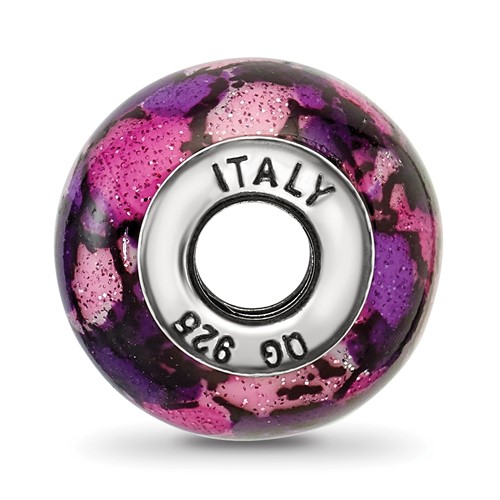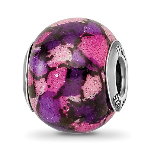 Pink and purple decorative overlay glass bead is made of antiqued sterling silver. This Reflections bead fits all major modular bracelet brands. Made in Italy.