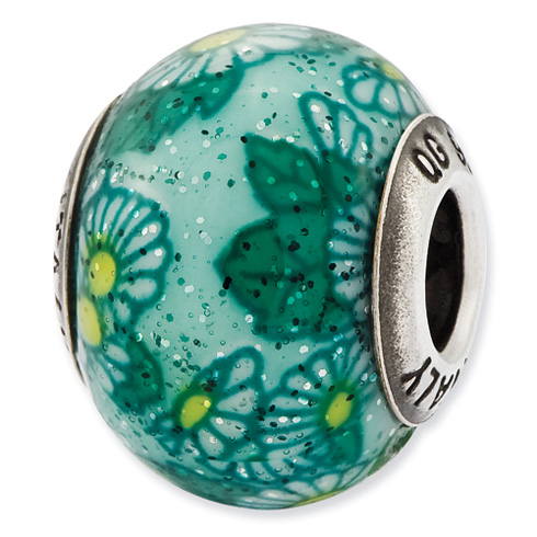 This teal glass bead has a floral design and glitter. Made of antiqued sterling silver. This Reflections bead fits all major modular bracelet brands. Made in Italy.
