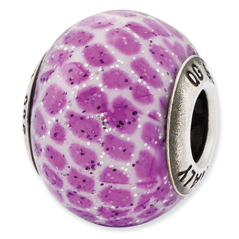 Purple glitter glass bead is made of antiqued, solid sterling silver. This bead fits all major modular bracelet brands. Imported.