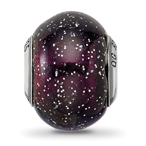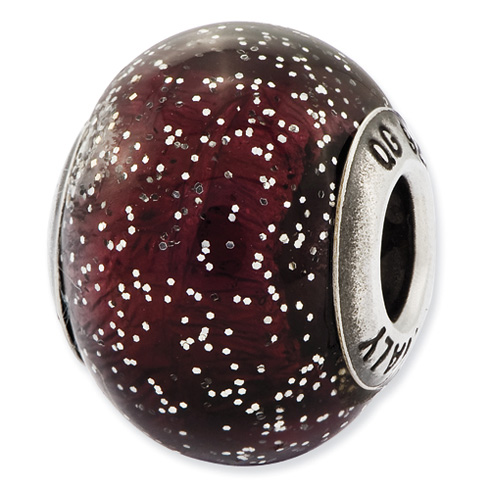 Italian dark purple with silver glitter glass bead is made of antiqued, solid sterling silver. This bead fits all major modular bracelet brands. Imported.