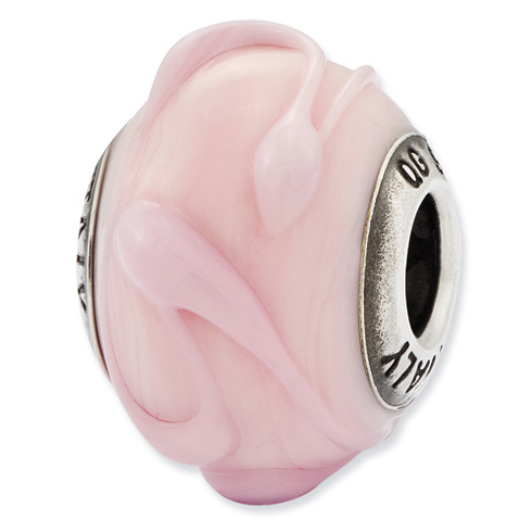 This round light pink glass bead has textured lines. Made of antiqued, solid sterling silver. This bead fits all major modular bracelet brands. Made in Italy.