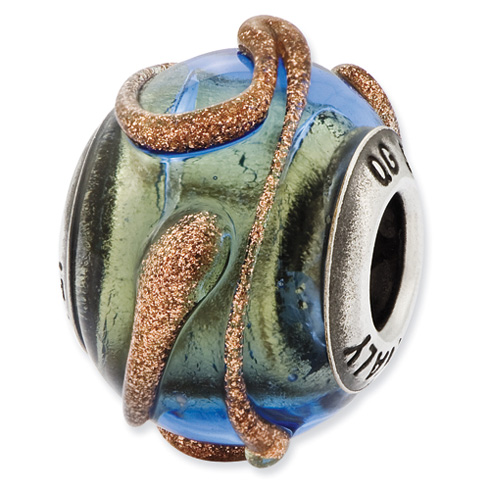 This round blue and green glass bead has brown textured lines. Made of antiqued, solid sterling silver. This Reflections bead fits all major modular bracelet brands. Made in Italy.