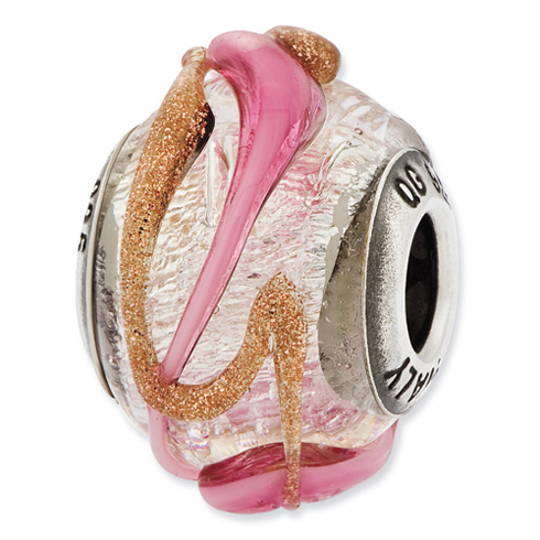 This round Murano silver glass bead has pink and brown lines. Made of antiqued, solid sterling silver. This bead fits all major modular bracelet brands. Imported.