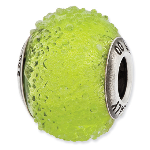 Light green textured glass bead is made of antiqued, solid sterling silver. This bead fits all major modular bracelet brands. Imported.