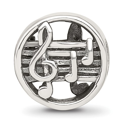 Round music notes and staff bead is made of antiqued, solid sterling silver. This bead fits all major modular bracelet brands. Imported.