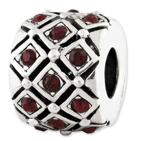 This checkerboard pattern bead has dark red Swarovski crystals all the way around and is made of antiqued sterling silver. This Reflections bead fits all major modular bracelet brands. Imported.