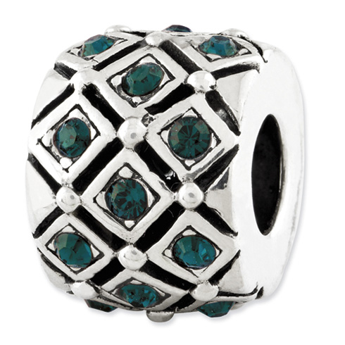 This checkerboard pattern bead has emerald Swarovski crystals all the way around and is made of antiqued sterling silver. This Reflections bead fits all major modular bracelet brands. Imported.