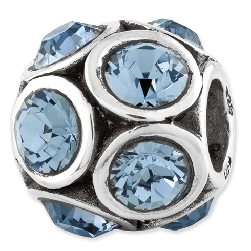 This round bead has light blue Swarovski crystals set in bezels all the way around and is made of antiqued sterling silver. This Reflections bead fits all major modular bracelet brands. Imported.