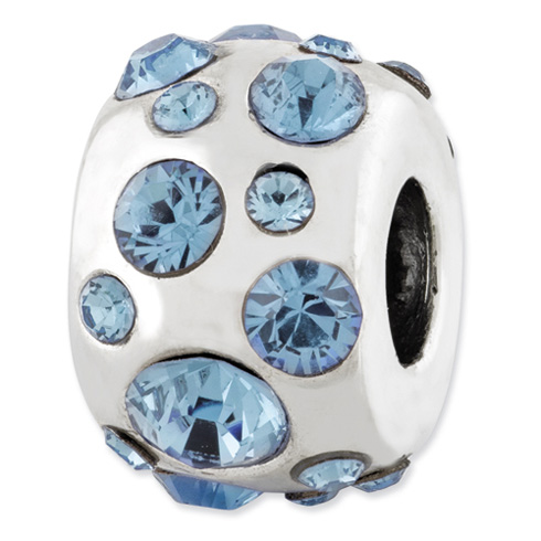 This bead has aquamarine blue Swarovski crystals all the way around and is made of antiqued sterling silver. This Reflections bead fits all major modular bracelet brands. Imported.
