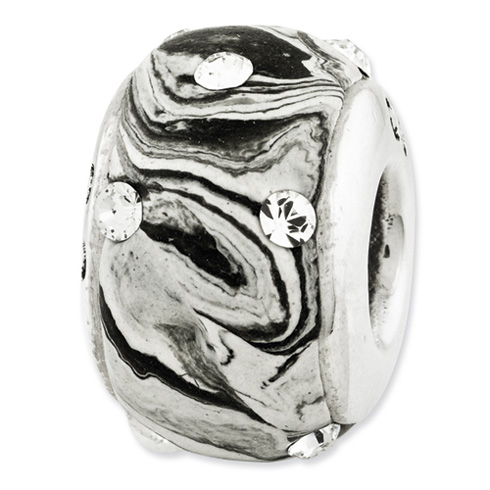 This light gray and dark gray swirl molded bead has clear Swarovski elements. Made of antiqued, solid sterling silver. This Reflections bead fits all major modular bracelet brands. Imported.