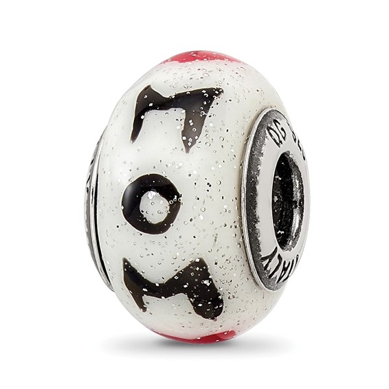 This Mom with hearts bead is made of white and red Murano glass and antiqued sterling silver. This Reflections bead fits all major modular bracelet brands. Imported.