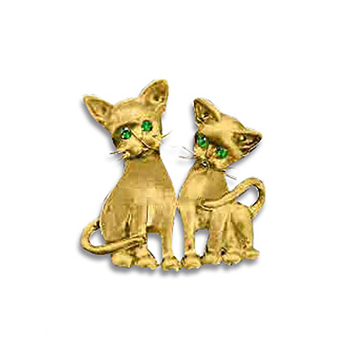 This three dimensional two kittens with emerald eyes pendant is made of solid 14k yellow gold. These pieces are not flat. They are dimensionally sculptural. Features emerald stone eyes. Designed by animal sculptor Jack Slack. Item size: 1in x 1in. Approximate weight: 6.5 grams. Made in the USA.