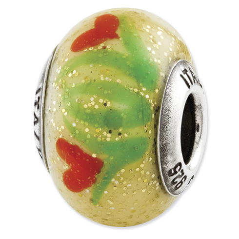 This round yellow Murano glass bead has orange flowers. Made of antiqued, solid sterling silver. This Reflections bead fits all major modular bracelet brands. Made in Italy.