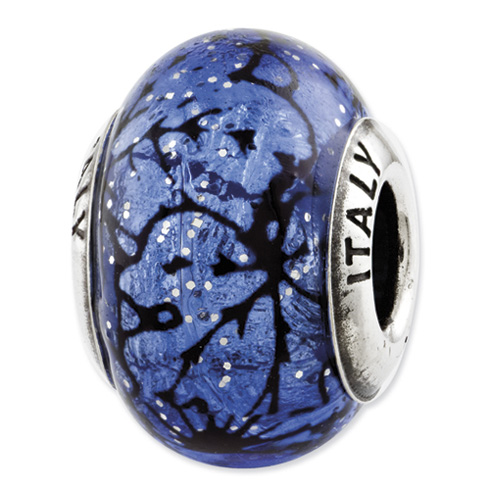 Blue Murano glass bead has black lines and white specks. Made of antiqued, solid sterling silver. This bead fits all major modular bracelet brands. Imported.