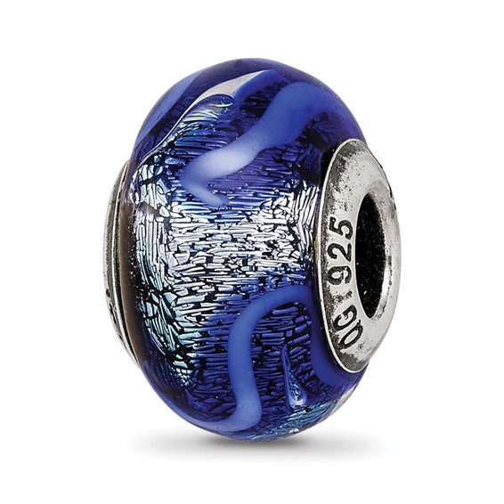 This round gray and light blue glass bead has dark blue swirls and is made of antiqued sterling silver. Size: 12.7mm x 9mm. This Reflections bead fits all major modular bracelet brands. Made in Italy.