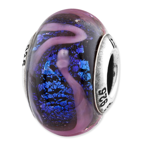 This round blue glass bead has purple swirls is made of antiqued sterling silver. Size: 12.7mm x 9mm. This Reflections bead fits all major modular bracelet brands. Made in Italy.