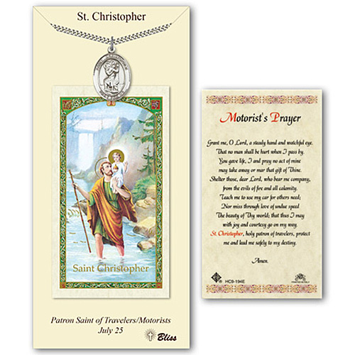Die struck, hand-engraved St Christopher pewter medal has the inscription: SAINT CHRISTOPHER PRAY FOR US. 24-inch stainless steel, endless heavy curb chain with silver plating. Dimensions: 1in x 3/4in. This item is the size of a quarter. Made in USA. Laminated, full color motorist's St Christopher prayer card is printed in Italy.