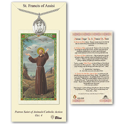 Die struck, hand-engraved pewter medal. Inscription: SAINT FRANCIS PRAY FOR US. Free 24-inch stainless steel, endless heavy curb chain with silver plating. Dimensions: 1in x 3/4in. This item is the size of a quarter. Made in USA. Laminated, full color St Francis prayer card is printed in Italy.