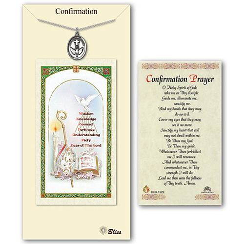 Die struck, hand-engraved pewter medal. Inscription: CONFIRMATION. Free 18-inch stainless steel, endless curb chain with silver plating. Dimensions: 3/4in x 1/2in. This item is the size of a penny. Made in USA. Laminated, full color Confirmation prayer card is printed in Italy.