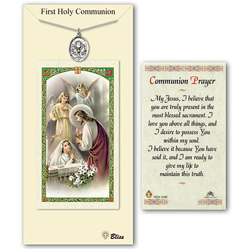 Die struck, hand-engraved pewter communion medal depicts a chalice. Free 18-inch stainless steel, endless curb chain with silver plating. Dimensions: 3/4in x 1/2in. This item is the size of a penny. Made in USA. Laminated, full color First Holy Communion prayer card is printed in Italy.