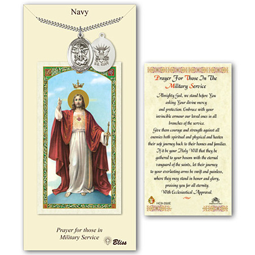 Die struck, hand-engraved pewter St Michael Navy medal has a 24-inch stainless steel, endless heavy curb chain with silver plating. Dimensions: 1in x 3/4in. This item is the size of a quarter. Inscription: SAINT MICHAEL PRAY FOR US. Made in USA. Laminated, full color St Michael prayer for those in military service card is printed in Italy.