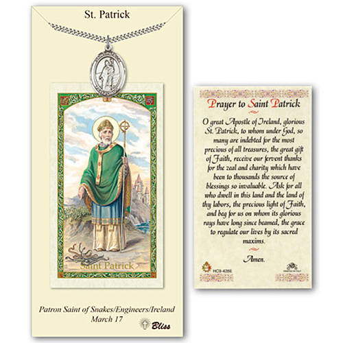 Die struck, hand-engraved pewter medal. Inscription: SAINT PATRICK PRAY FOR US. Free 24-inch stainless steel, endless heavy curb chain with silver plating. Dimensions: 1in x 3/4in. This item is the size of a quarter. Made in USA. Laminated, full color St Patrick prayer card is printed in Italy.