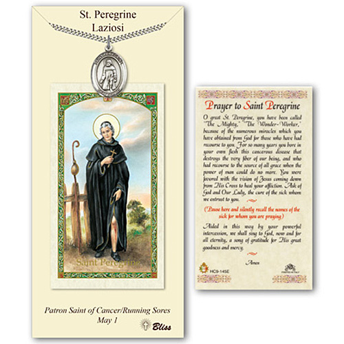 Die struck, hand-engraved St. Peregrine medal is made of pewter. Inscription: SAINT PEREGRINE PRAY FOR US. 24-inch stainless steel, endless heavy curb chain with silver plating. Dimensions: 1in x 3/4in. This item is the size of a quarter. Made in USA. Laminated, full color St Peregrine prayer card is printed in Italy.