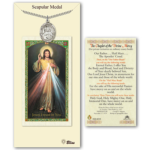 Die struck, hand-engraved pewter medal. Inscription: LEARN OF ME I AM THE WAY THE TRUTH AND THE LIFE. Free 24-inch stainless steel, endless heavy curb chain with silver plating. Dimensions: 1in x 3/4in. This item is the size of a quarter. Made in USA. Laminated, full color Chaplet of the Divine Mercy prayer card is printed in Italy.