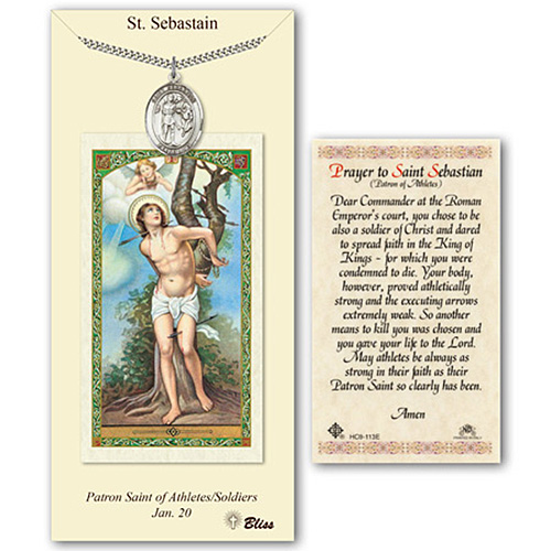 St Sebastian pewter medal and prayer card. Inscription: SAINT SEBASTIAN PRAY FOR US. 24-inch stainless steel, endless heavy curb chain with silver plating. Dimensions: 1in x 3/4in. This item is the size of a quarter. Made in USA. Laminated, full color St Sebastian prayer card is printed in Italy.
