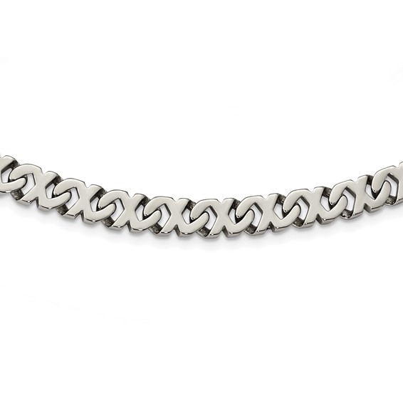 Men's necklace has X-shaped links made of stainless steel. Link width: 8mm. Length: 24in. Fancy lobster clasp. Weight: 68.5 grams. This necklace is composed of grade 316 stainless steel, known for its superior corrosion resistance. 316 stainless steel is commonly used in stainless steel jewelry. Insist on 316 stainless steel. 316 steel is also known as marine grade stainless steel, for its high resistance to chloride corrosion. Stainless steel will not oxidize [rust] nor turn black. Imported.
