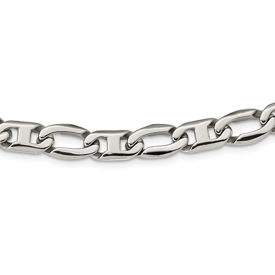 Stainless steel necklace features alternating anchor and open links. Link width: 10mm to 12mm. Length: 24in. Fancy lobster clasp. Weight: 90.2 grams. This necklace is composed of grade 316 stainless steel, known for its superior corrosion resistance. 316 stainless steel is commonly used in stainless steel jewelry. Insist on 316 stainless steel. 316 steel is also known as marine grade stainless steel, for its high resistance to chloride corrosion. Stainless steel will not oxidize [rust] nor turn black. Imported.