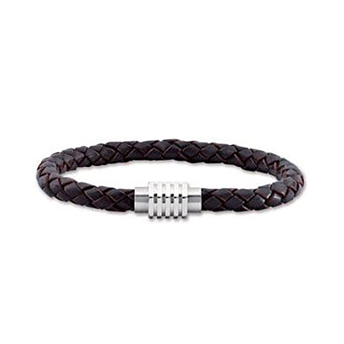 Dark brown leather woven bracelet features a round slotted steel magnetic clasp. Bracelet length: 8 1/2in, width: 1/4in. Imported.