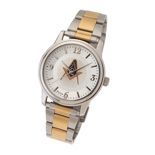 Bulova masonic watch has a 38mm stainless steel case with hour, minute and sweep second hands. Two tone stainless steel fold over clasp bracelet. Fine quartz movement, white round face. G, compass and set square in center. Limited 1 year warranty.