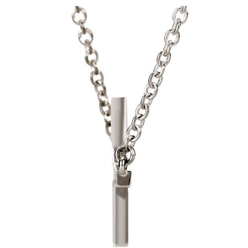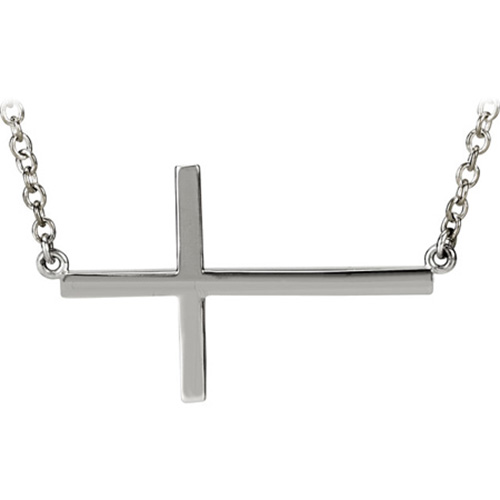 Sideways cross is made of polished, solid sterling silver. 5/8in x 5/16in cross is attached to 16in cable chain. The cross is slightly smaller than a dime. Chain width: 1.5mm. Spring ring clasp. Item weight: 2.68 grams. Imported.