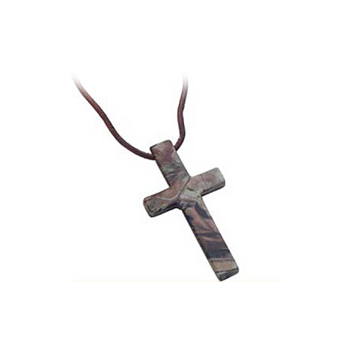 This hunter's cross features Realtree AP camo design. Solid steel and adjustable genuine dark brown leather cord. Camo cross dimensions: 1 3/4in x 7/8in. Leather cord length: 31in. Made in the USA.
