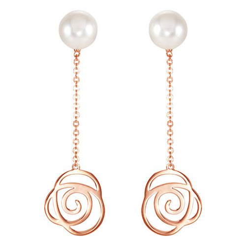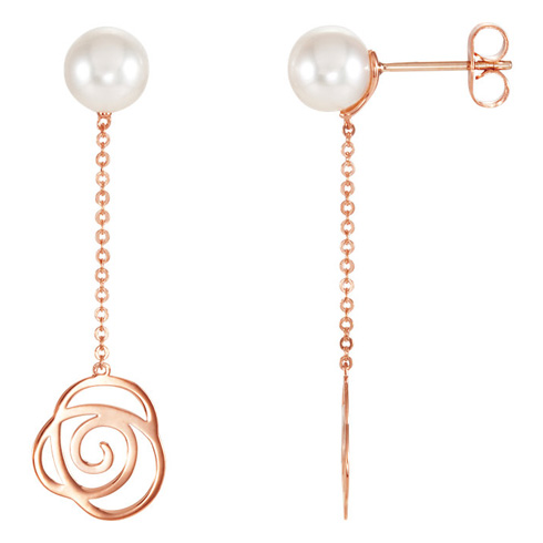 Dangling freshwater pearl earrings feature a floral design. Earrings are made of polished, solid 14kt rose gold. Earring dimensions: 1 1/2in x 1/2in. Pearl details: 6.5mm diameter, very light cream to pinkish-white to white. Ver good luster. Earrings approximate weight: 1.2 grams.
