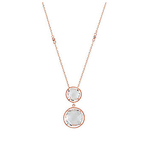 Rose gold plated necklace features two 1.75mm, one 10mm and one 14mm genuine checkerboard clear quartz gemstones. This necklace matches gold plated earrings, item number JJ69536. Necklace length: 17in.