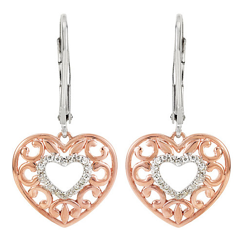 Lever back heart shaped earrings are made of rose gold plated sterling silver. Earrings approximate weight: 1.9 grams. Diamond details: 36 x .003 ct round diamond accents, I2 clarity, H color. Earring dimensions: 31mm x 14mm.