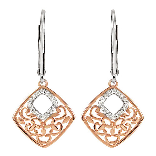 Lever back square earrings are made of rose gold plated sterling silver. Earrings approximate weight: 1.45 grams. Diamond details: 8 x .030 ct, 24 x .005 ct round diamond accents, I2 clarity, H color. Earring dimensions: 34mm x 14mm.