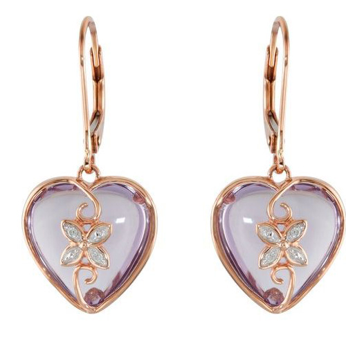 Lever back heart earrings are set with 12mm x 12mm genuine rose de france amethyst double cabochon gemstones. 14kt rose gold. Earrings approximate weight: 1.9 grams. Diamond details: 4 x .016 ct round diamond accents, I2 clarity, H color.