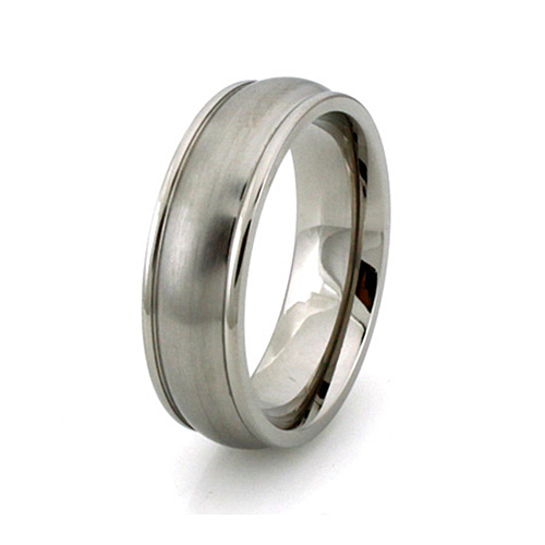 This titanium ring features a a domed center with satin finish and polished grooved edges. Ring width: 7mm. Available in whole and half finger sizes 8-12 only. Comfort fit. Made of commercially pure [CP] titanium in China.