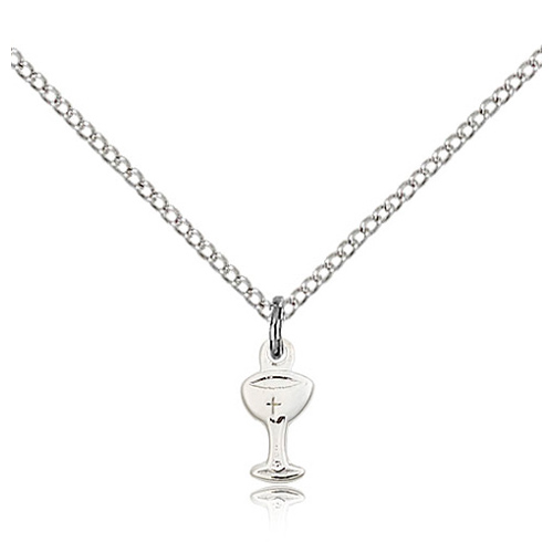 Die struck, hand-engraved chalice medal is made of sterling silver. 18-inch sterling silver lite curb chain with lobster clasp. Dimensions: 3/8in x 1/8in. This item is half the size of a penny and is a great gift for communion. Made in USA.