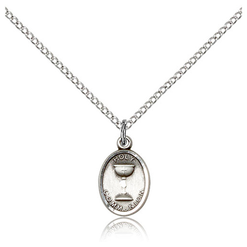 This small oval Holy Communion medal is made of sterling silver. 18-inch sterling silver lite curb chain with lobster clasp. Inscription: HOLY COMMUNION. Dimensions: 3/8in x 1/2in. This pendant is half the size of a penny. Die struck, hand-engraved. Made in USA.