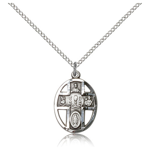 Die struck, hand-engraved five way cross communion medal is made of sterling silver. Dimensions: 3/4in x 1/2in. 18-inch sterling silver lite curb chain with lobster clasp. This item is the size of a penny and is a great communion gift. Made in USA.