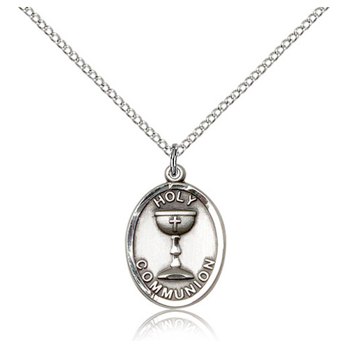 Die struck, hand-engraved communion medal is made of sterling silver. Sterling silver 18-inch lite curb chain with lobster clasp. Dimensions: 3/4in x 1/2in. Inscription: HOLY COMMUNION. This item is the size of a penny and is a great communion gift. Made in USA.
